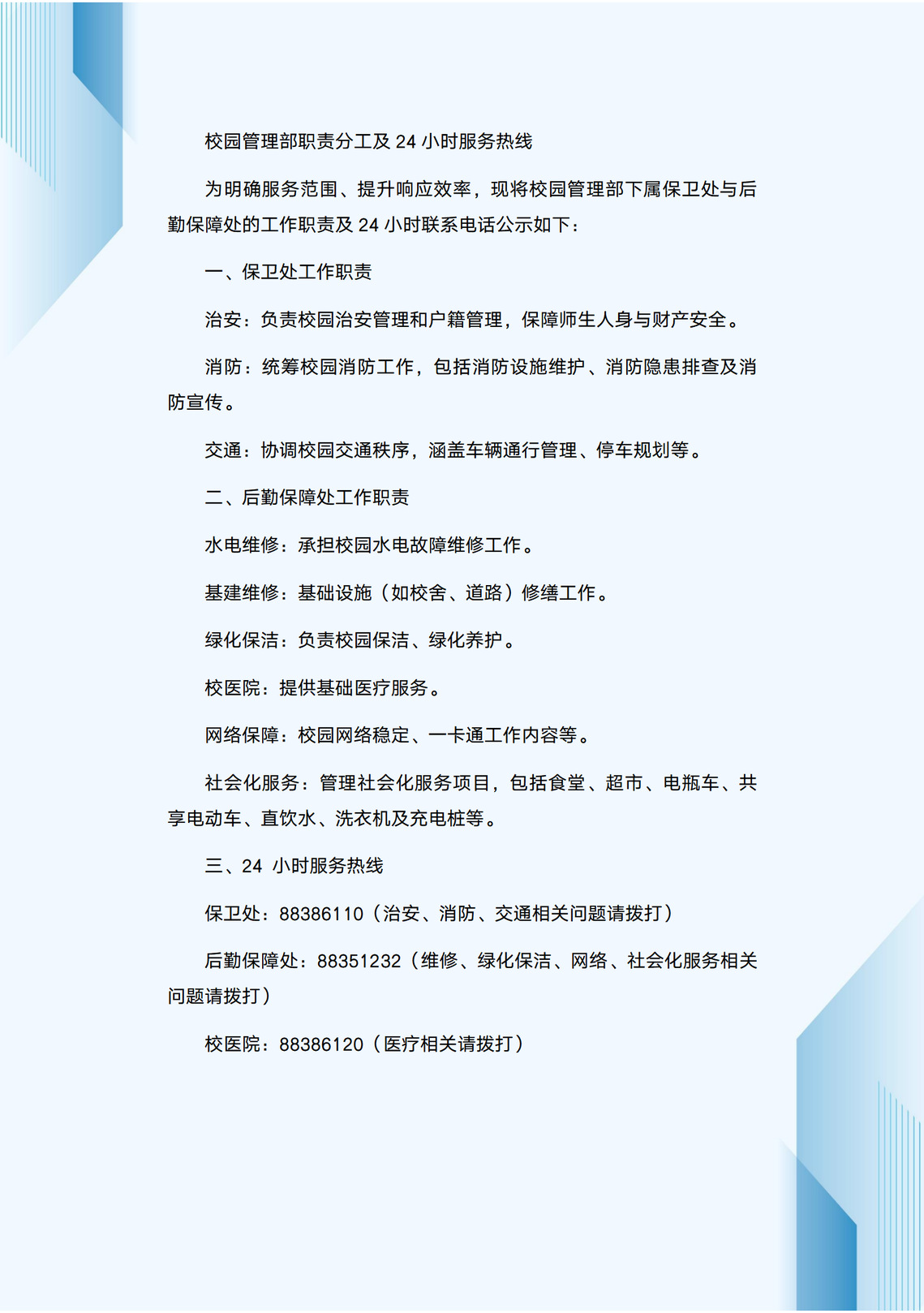 校园管理部职责分工及24小时服务热线